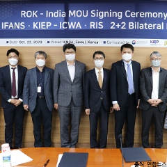 KIEP, 인도 주요 연구기관과 정책대화 MOU 체결대외경제정책연구원(KIEP)과 외교부 국립외교원 외교안보연구소는 10월 22일(목) 인도세계문제협회(ICWA), 인도 개발도상국정보연구원(RIS)과 2+2 상호 교류·협력을 위한 양해각서(MOU)를 체결했다. 본 체결식은 서울 국립외교원과 인도 뉴델리 인도세계문제협회를 연결한 화상회의 방식으로 개최되었으며, 정성춘 KIEP 부원장을 비롯해 김준형 국립외교원장, 티시에이 라가반 ICWA 소장, 사친 차투르베디 RIS 소장, 신봉길 주인도 한국대사, 스리프리야 란가나탄 주한 인도대사, 최원기 국립외교원 아세안·인도연구센터 책임교수, 조충제 KIEP 세계지역연구센터 소장 등이 참석했다. 이번 양해각서를 통해 양국은 정책대화 및 교류·협력을 제도화하여, 신남방정책 고도화 차원에서 한·인도 협력 강화방안을 제시하기 위한 연구기관 간 플랫폼을 확대하기로 의견을 모았다. 참석자들은 나아가 이날 정책대화 출범을 계기로 양국 4개 연구기관이 한·인도 관계 발전을 위해 더욱 긴밀한 연구협력을 증진시켜 나가기를 희망한다고 밝혔다.- 행사명: 한·인도 교류·협력 양해각서(MOU) 체결식- 일시: 2020년 10월 22일(목)- 장소: 서울 국립외교원- 주최: 대외경제정책연구원(KIEP), 외교부 국립외교원 외교안보연구소, 인도세계문제협회(ICWA), 인도 개발도상국정보연구원(RIS)작성자 최고관리자 작성일 2020/10/22 조회수 2,635