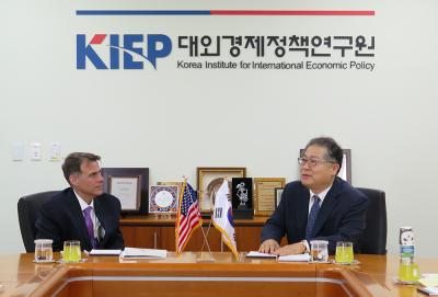 Robert Kaproth 美 재무부 아시아담당 부차관보 일행 KIEP 방문Robert Kaproth 미(美) 재무부 아시아담당 부차관보가 5월 29일(수) 대외경제정책연구원(KIEP) 이재영 원장을 예방하고, 원내 연구진과 면담을 가졌다. Kaproth 부차관보와 Rachel Lyngaas 경제담당관 등 일행은 이날 이재영 원장을 비롯해 KIEP 연구진들과 다양한 국제경제 현안들에 대해 의견을 교환했다. 양측은 이번 면담이 글로벌 경제 및 한·미 협력 현안에 대한 상호 이해와 인식의 지평을 넓히는 유익한 시간이었다고 평가했다. - 행사명: Robert Kaproth 美 재무부 아시아담당 부차관보 방원- 일시: 2019년 5월 29일(수), 14:00~15:00작성자 최고관리자 작성일 2019/05/29 조회수 1,466