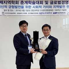KIEP, ‘2019년 글로벌 경영대상’ 수상대외경제정책연구원(KIEP)은 6월 1일(토) 서울 중앙대학교 100주년 기념관에서 개최된 ‘2019년 국제지역학회 춘계학술대회 및 글로벌 경영대상 시상식’에서 글로벌 경영대상을 수상하였다. 본 행사는 한국 국제지역학회가 설립 23주년을 맞아 “혁신적 균형발전을 위한 사회적 가치와 지역발전 전략”이라는 주제로 진행한 학술대회에서 세계적으로 괄목할만한 연구 성과를 내고, 국가 정책기반 마련에 이바지한 연구기관을 대상으로 그 공로를 인정하고자 마련되었다. 국제지역학회는 수상자로 선정된 KIEP가 국책연구기관으로서의 한계를 극복하고 글로벌 경쟁력 제고를 통해 세계 유수의 연구원으로 발돋움한 공적을 높이 평가했다며 ‘2019년 글로벌 경영대상’ 선정 사유를 밝혔다. KIEP는 올해 초 미국 펜실베이니아대학교 국제관계프로그램 산하 싱크탱크와 시민사회 프로그램(TTCSP)이 실시한 ‘2018 전 세계 싱크탱크 평가’에서 국제경제정책 부문 세계 5위, 아시아 1위에 이름을 올린 바 있다. 이날 양평섭 KIEP 세계지역연구센터 소장이 이재영 원장을 대신해 수상자로 연단에 올랐다. * ‘2018 전 세계 싱크탱크 평가’ 결과 보러가기: KIEP 홈페이지, TTCSP 홈페이지* 사진제공: 국제지역학회작성자 최고관리자 작성일 2019/06/01 조회수 2,277